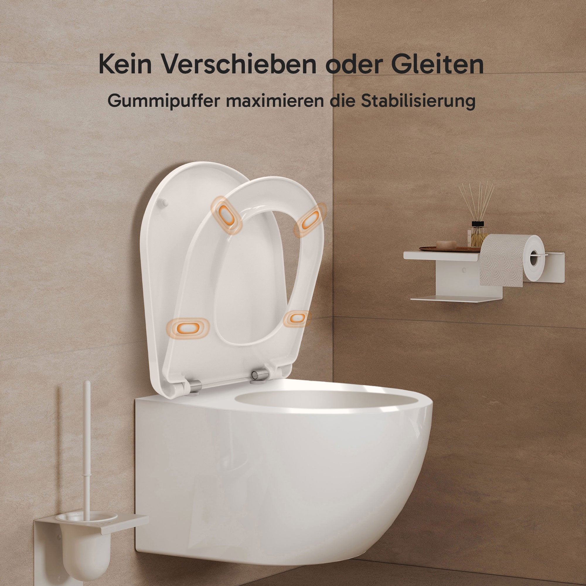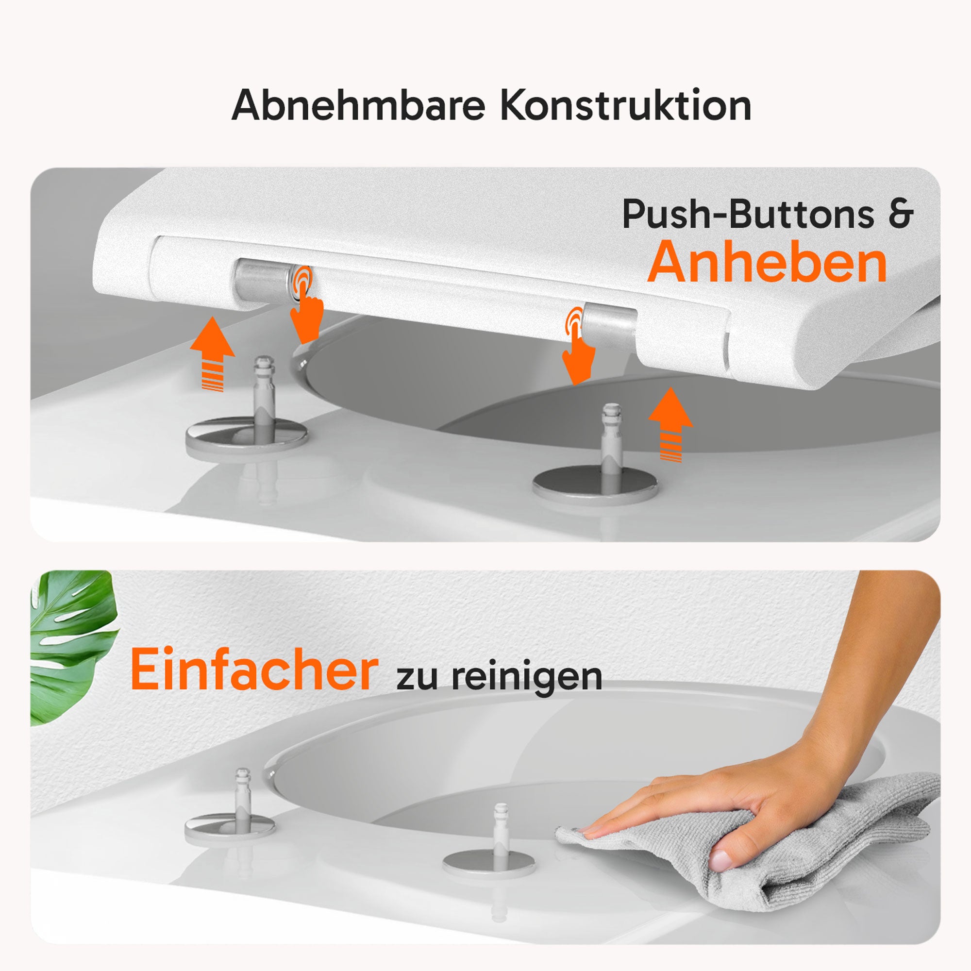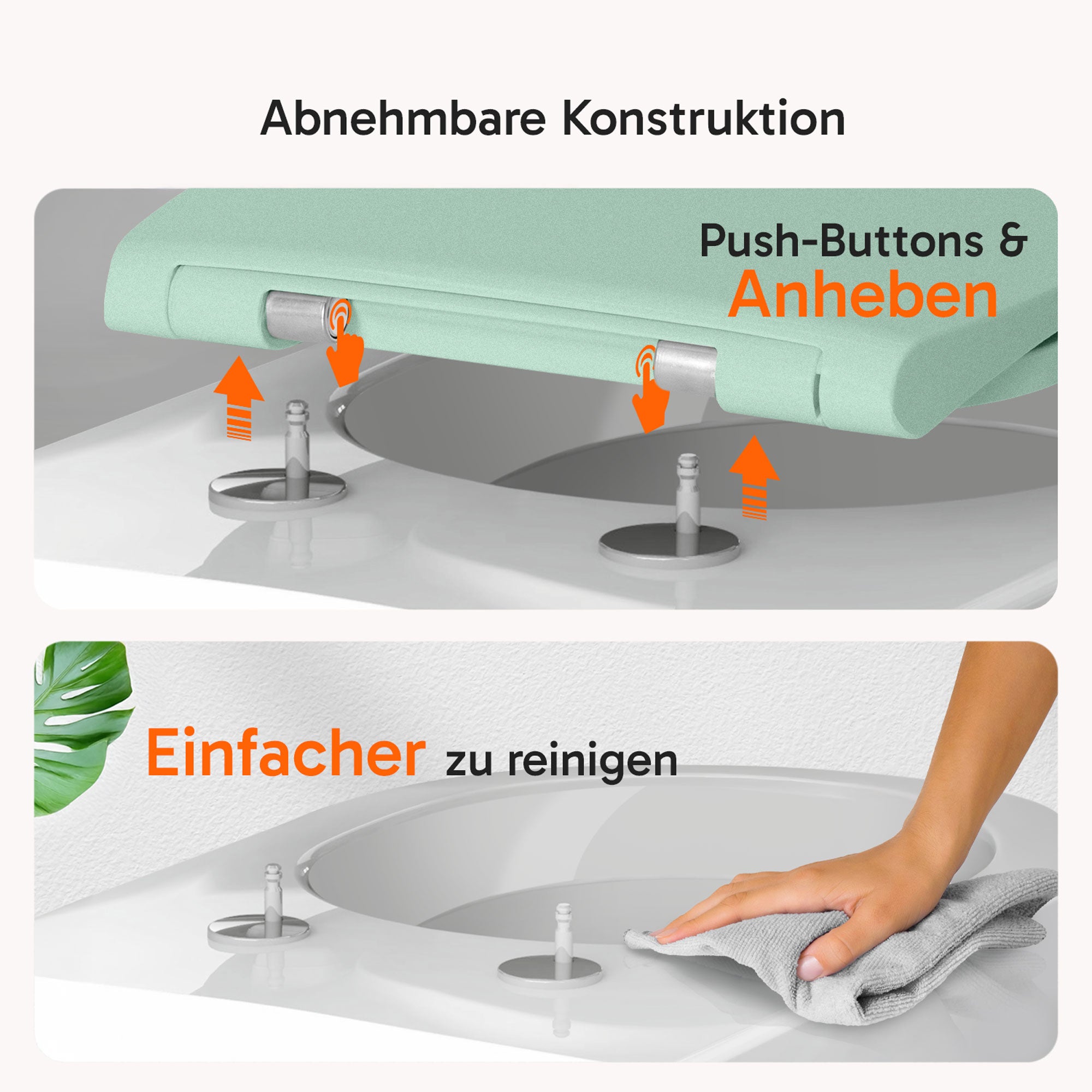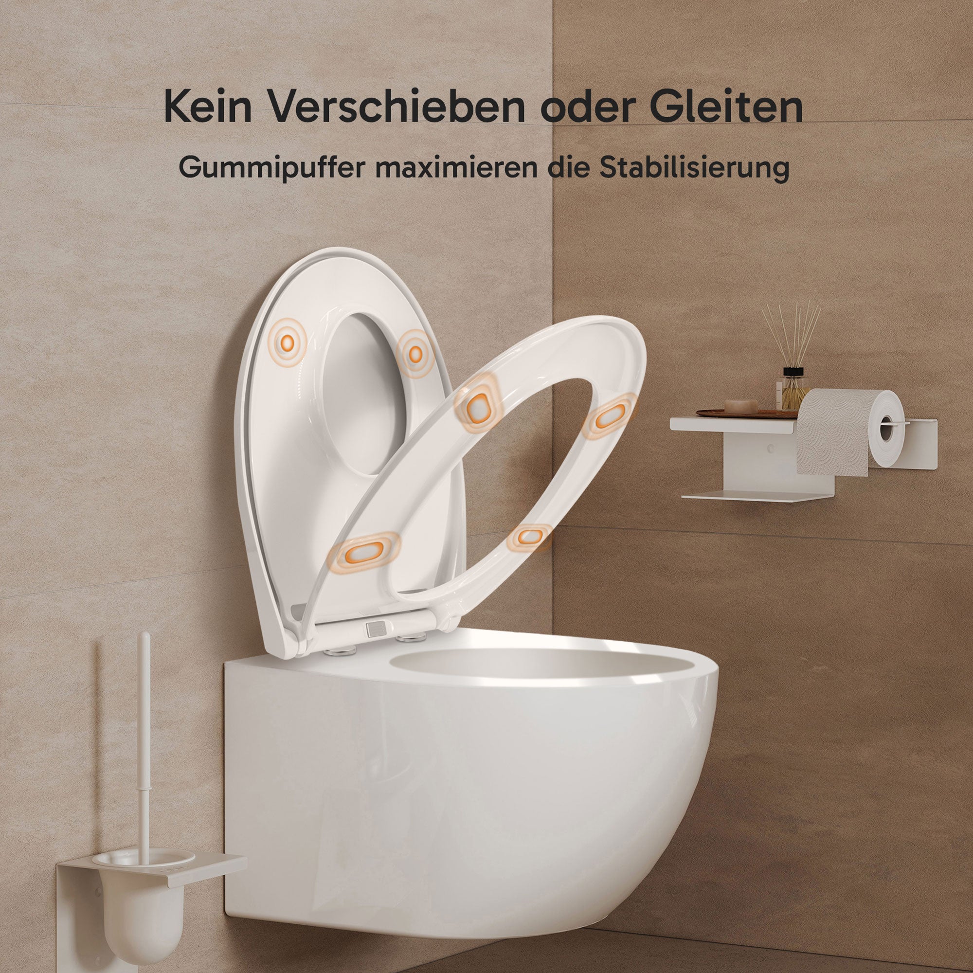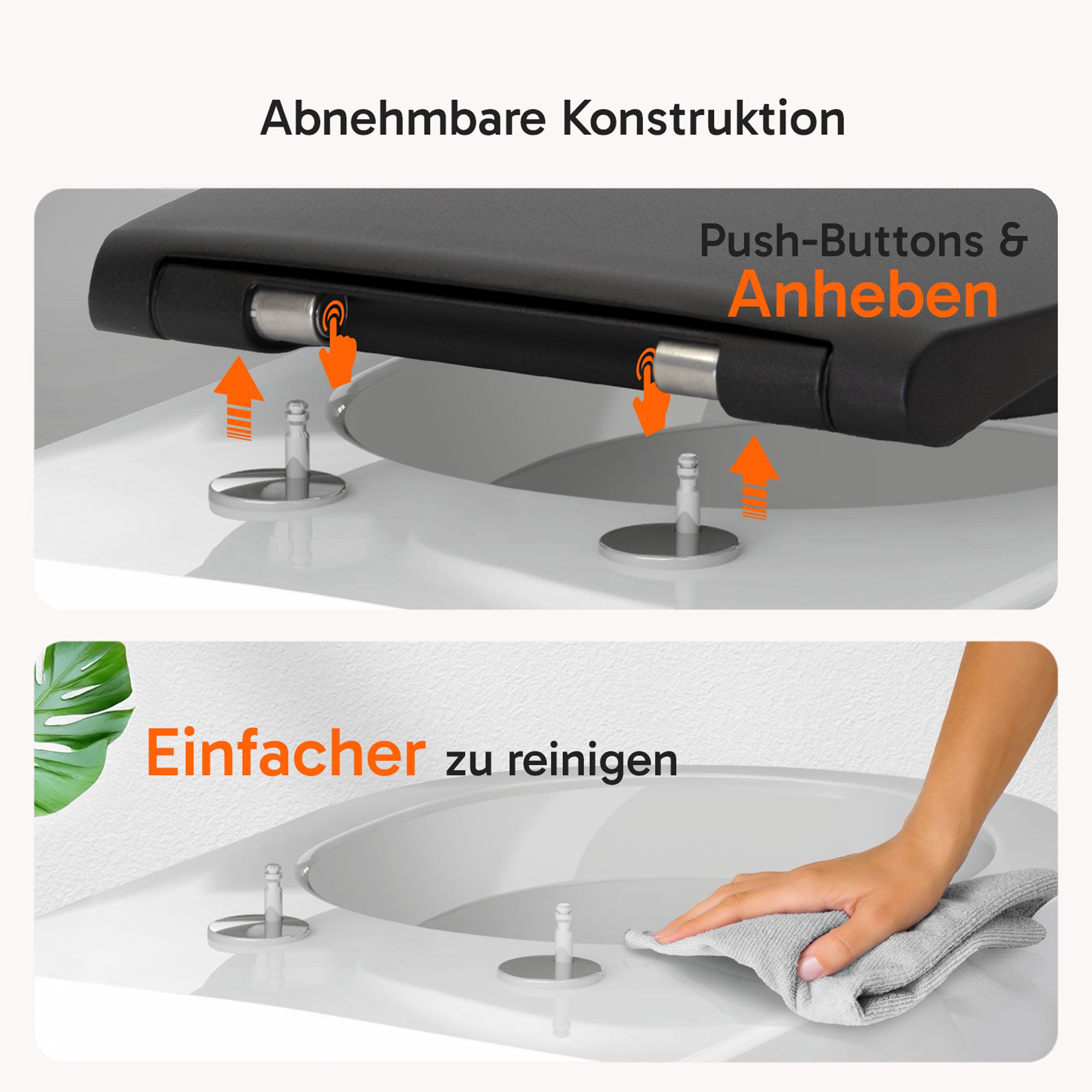 Gefertigt aus hochwertigen Duroplast mit antibakteriellen Additiven, vereint er höchste Materialqualität mit aktivem Hygieneschutz. Das Push-Edelstahlscharnier ermöglicht eine mühelose Abnahme des Sitzes für gründliche Reinigung, während die Soft-Close-Funktion Brille und Deckel leise und sanft schließen lässt.
